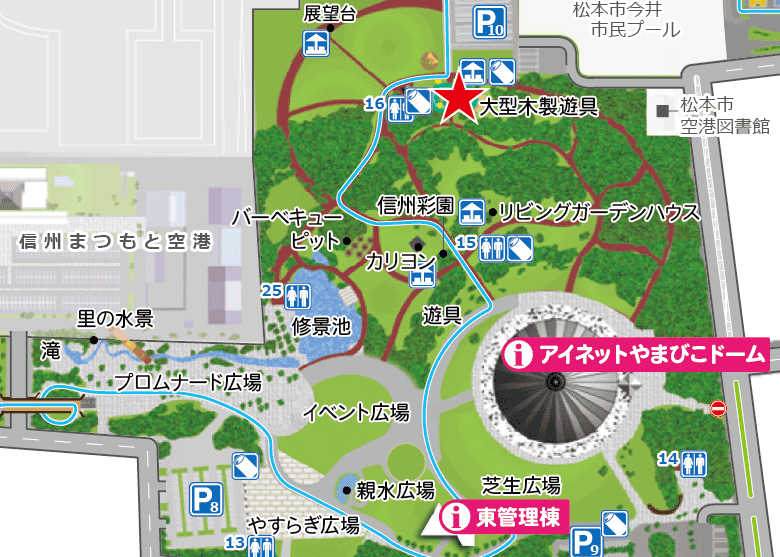 アイネットやまびこドームの西側に位置し、すぐ近くには信州まつもと空港の滑走路を目前とした見晴らしの良い展望台があります。大型木製遊具には、すべり台・プラネタリウム・クライムアップなど、たくさんの遊具設備があります。大型木製遊具周辺にも、ザイルクライム・ターザンロープ・スプリング遊具などあり、この辺りは大勢の人で賑わいます。